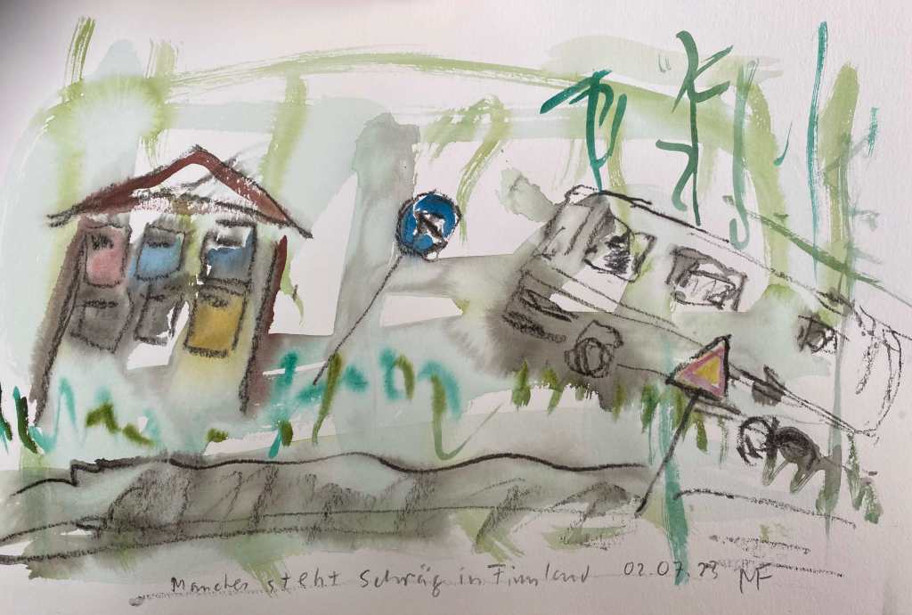 About the use of Finnish bus shelters: In Finland, the bus shelters are often quite crooked in the area, which encouraged me to make ironic drawings. 60×40 cm, 2023, (Über die Verwendung Finnischer Wartehäuschen: In Finnland stehen die Wartehäuschen oft recht windschief in der Gegend herum, was mich zu ironischen Zeichnungen animierte.) #watercolors #aquarellskizzen #manfredforschnerart #bbk-mannheim #modernart #experimentalart #badsachsa #watercolorpainting #germanartist #experimentalart