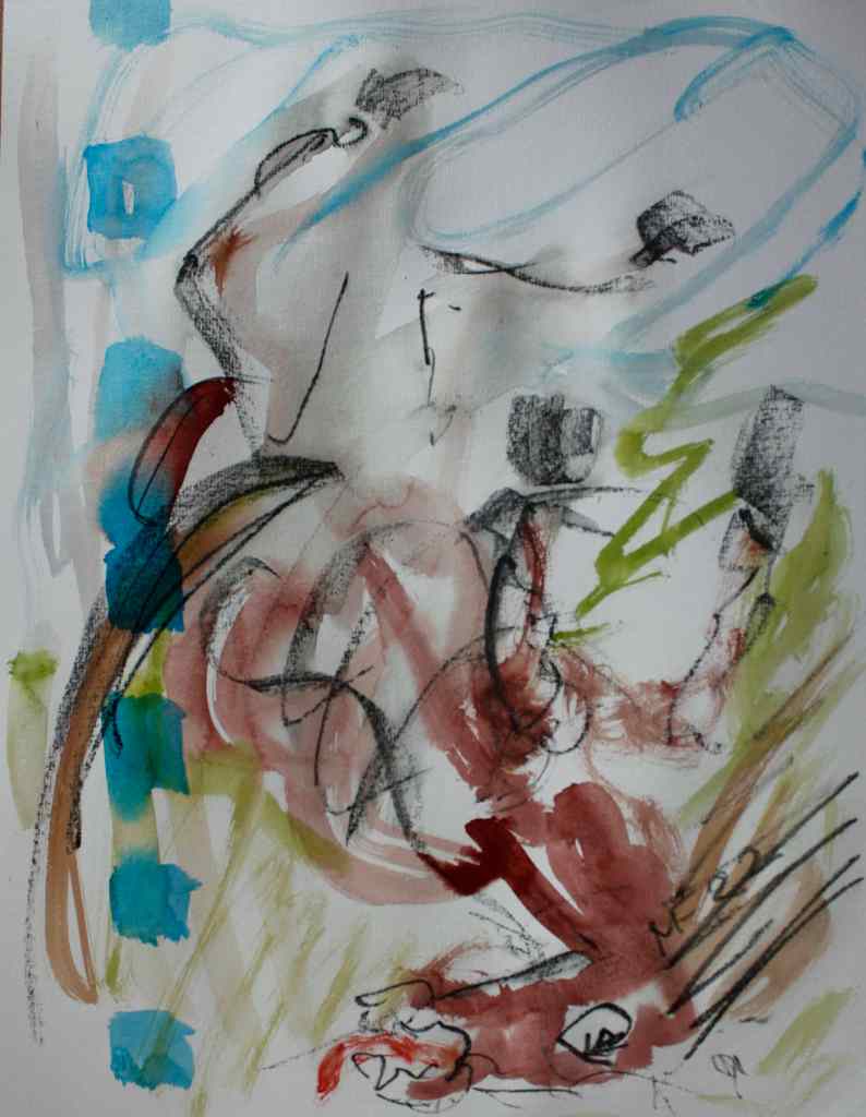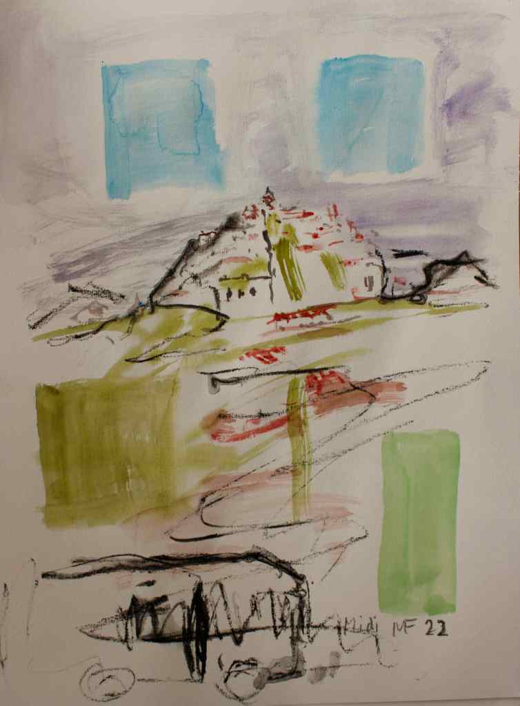 Four watercolours from a trip to the Pyrenees, (Vier weitere Aquarelle einer Fahrt zu den Pyrenäen) 2022, 40×60 cm, Built-up hill in the #Midi – les #Pyrénés – – Swaying #Horse – Study after the Mirror, #aquarell #frankreich #pyrenaeen #manfredforschnerart #fineart #france #germanart #europeanart #artnet #absolvia #aktivitas