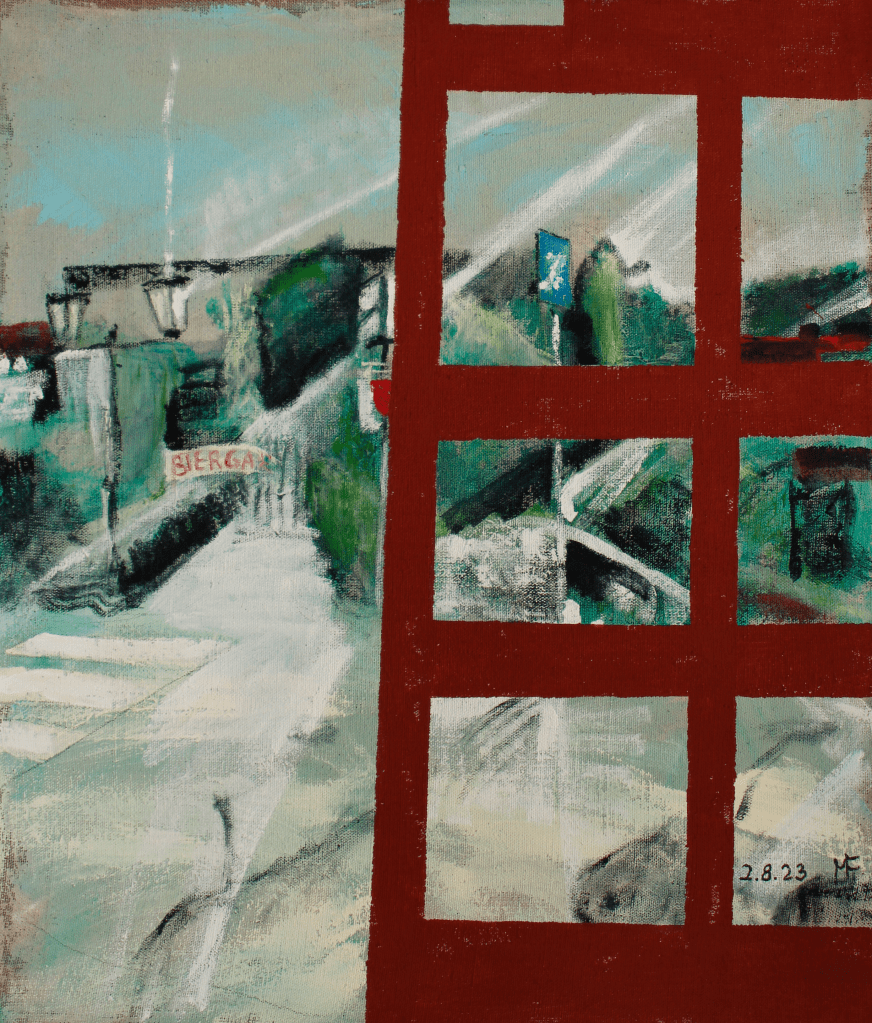 Street scene in Bad Sachsa on eight surfaces, 60x70 cm, acrylic on canvas, second August 2023 (Straßenbild in Bad Sachsa auf acht Flächen, 60x70 cm, Acryl auf Leinwand, 2. 8. 2023) #absolvia #activitas #pädagogium #badsachsa #studentmonument #modernart #germanart #manfredforschnerart #monument #harzmontain #europaenart