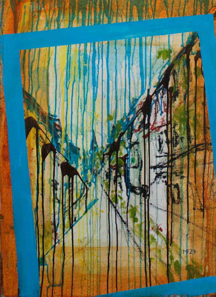 „Bad Sachsa – Marktstraße“ framed in monochrome blue (in monochromem Blau gerahmt), 2024, 70×90 cm, #germanartist #manfredforschnerart #absolvia #badsachsa #eurasianart #modernart #experimentalart